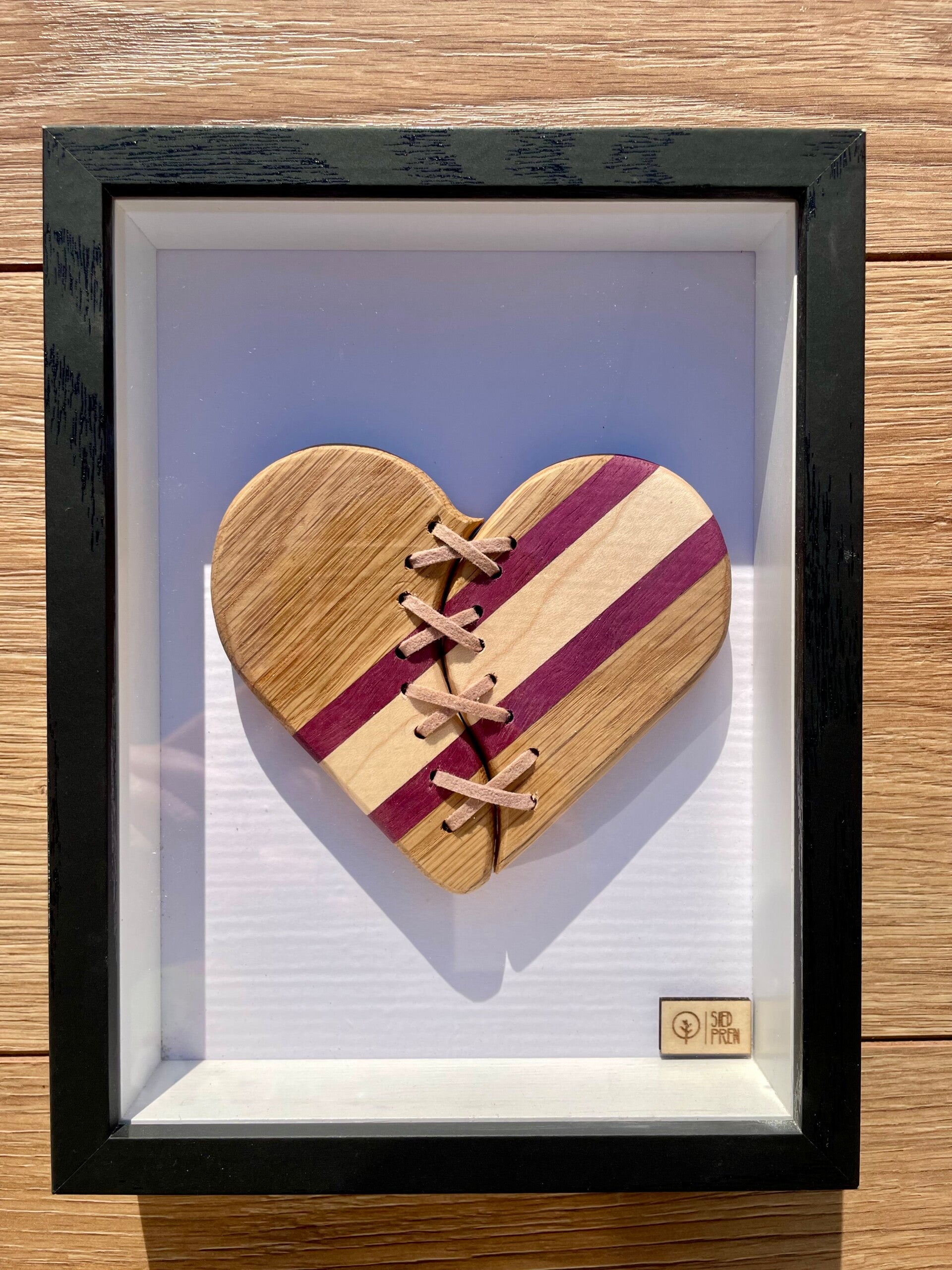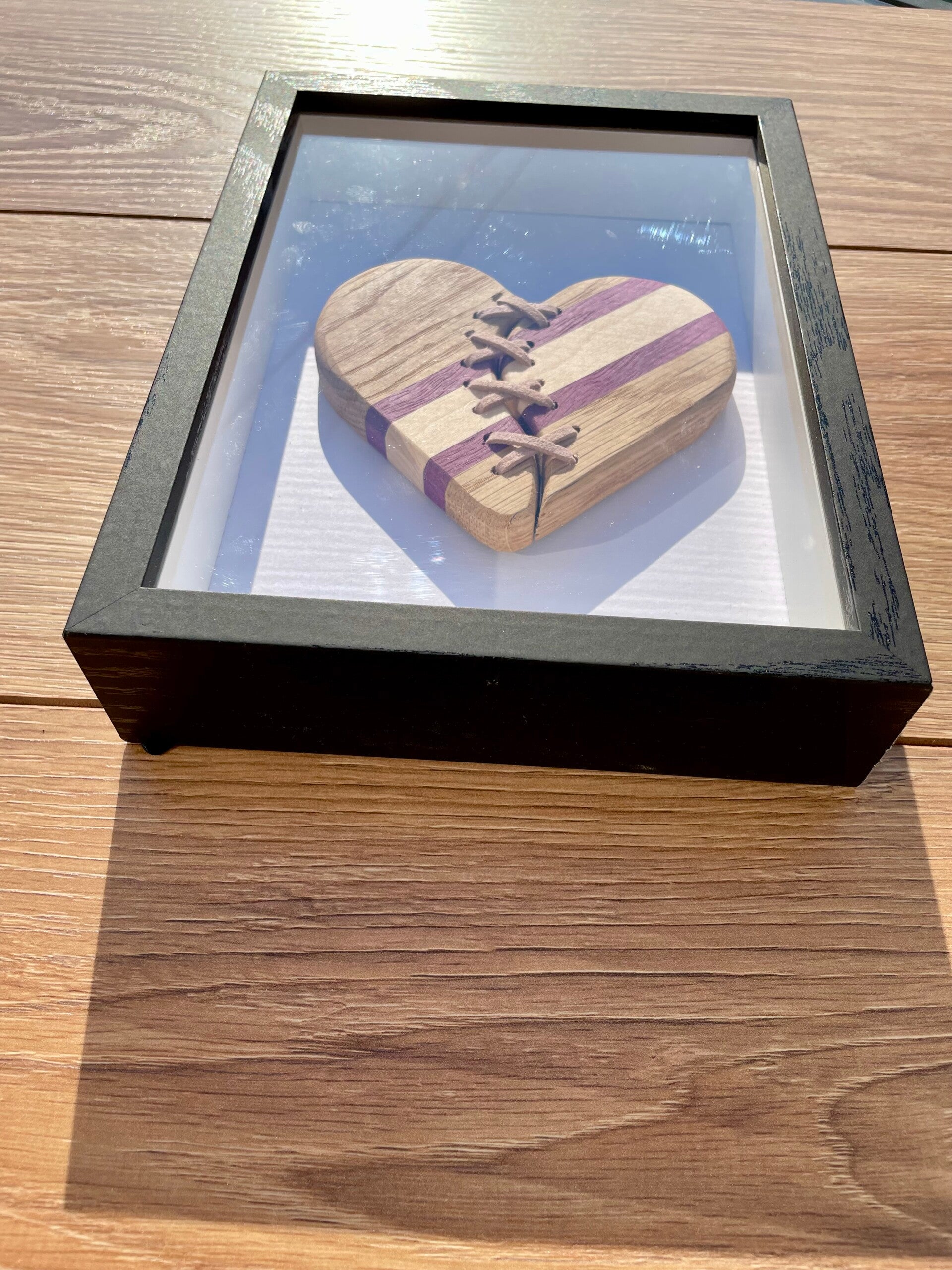This unique piece features a handmade wooden heart, crafted from contrasting oak and purpleheart woods, symbolically stitched together with leather lacing. Set inside a deep shadow box frame, it’s perfect as a thoughtful gift for someone special or as meaningful decor for your home.